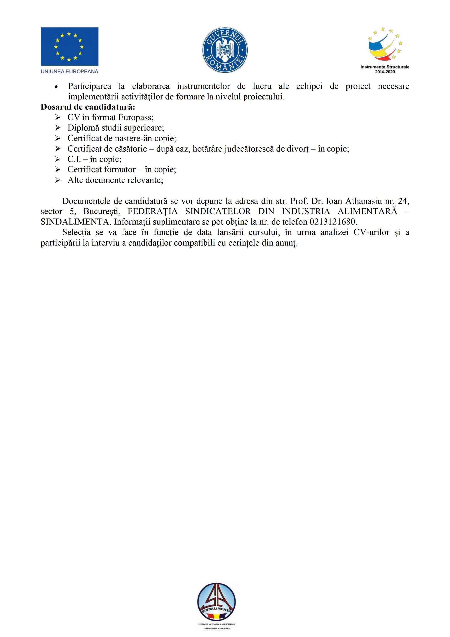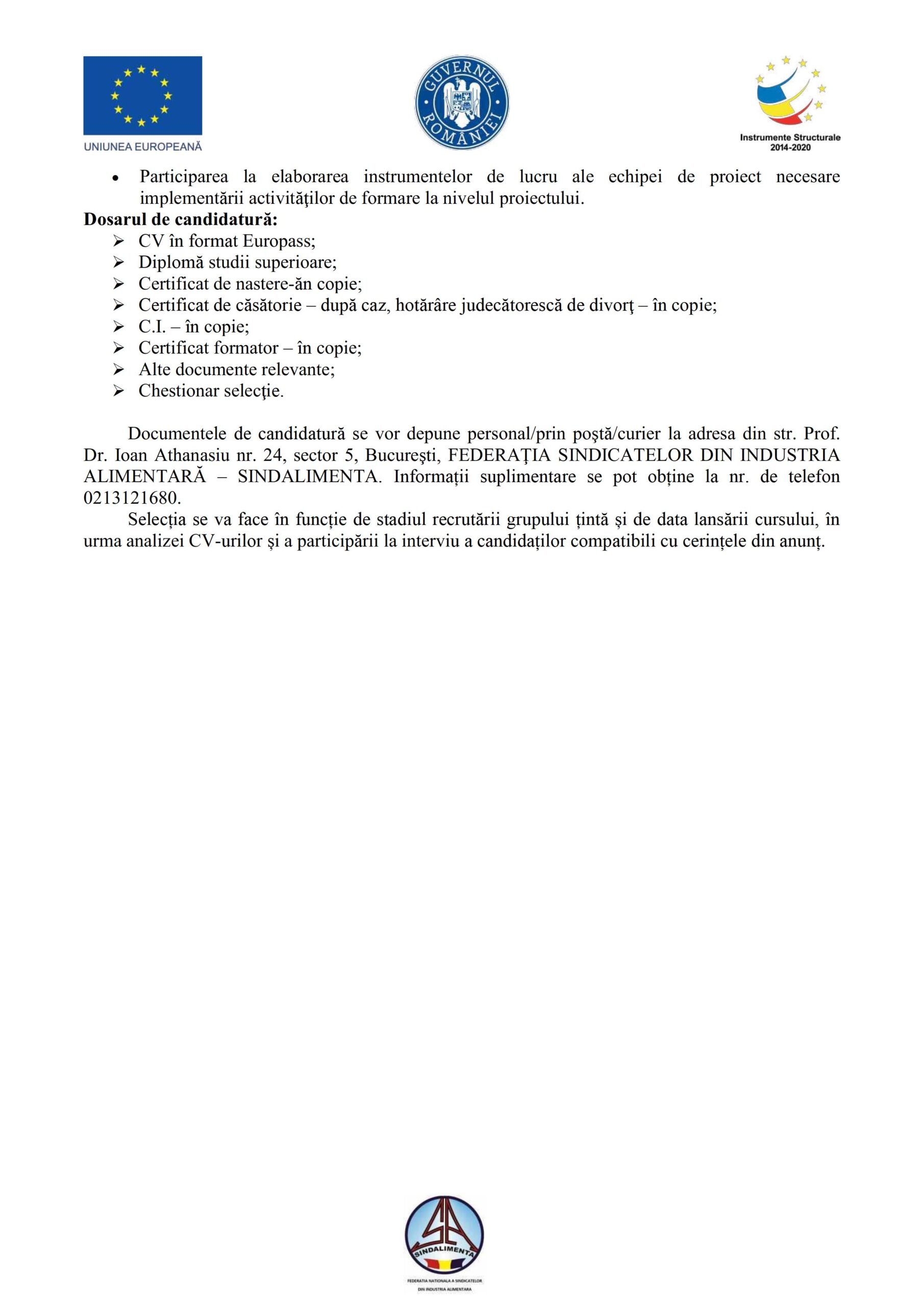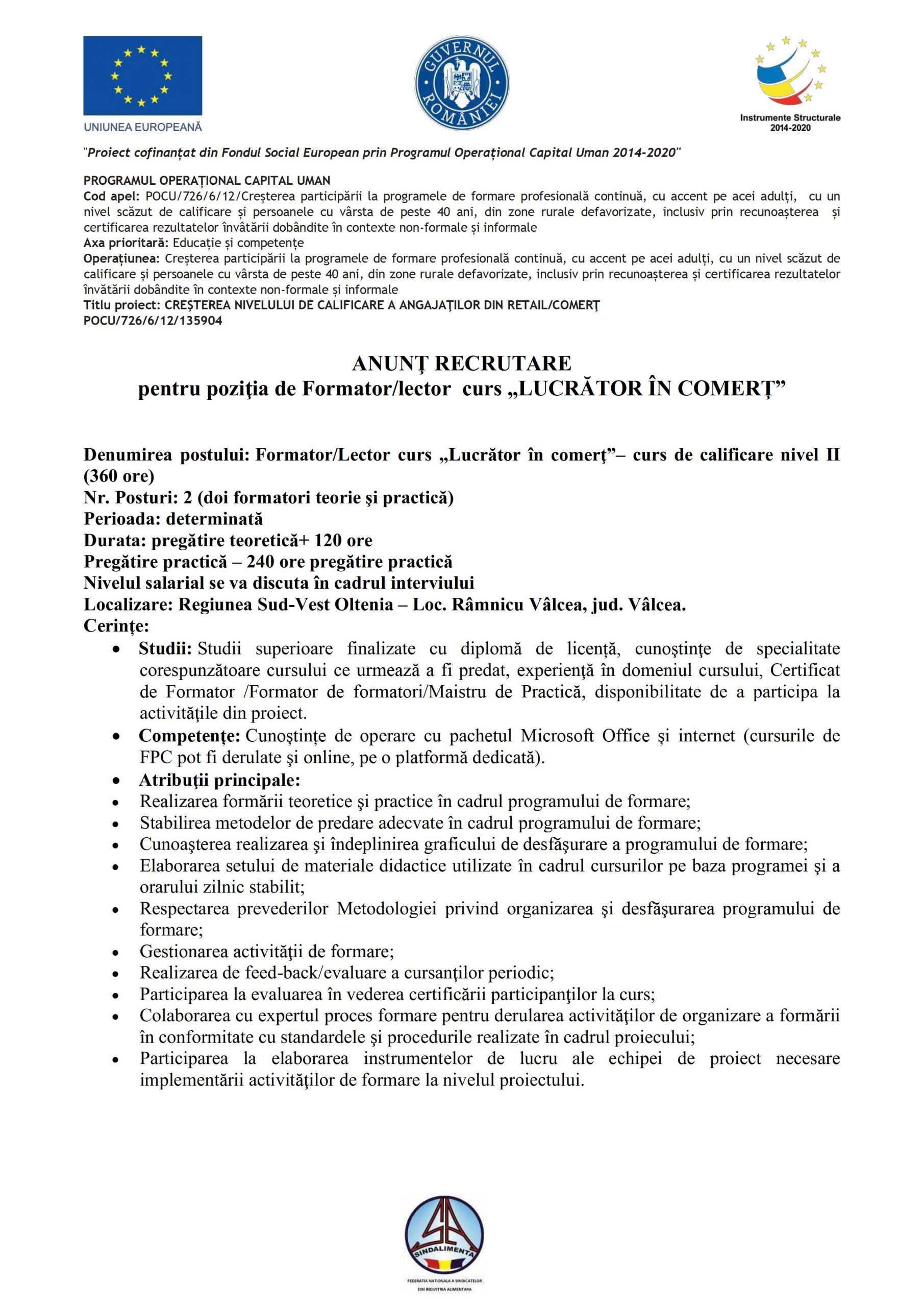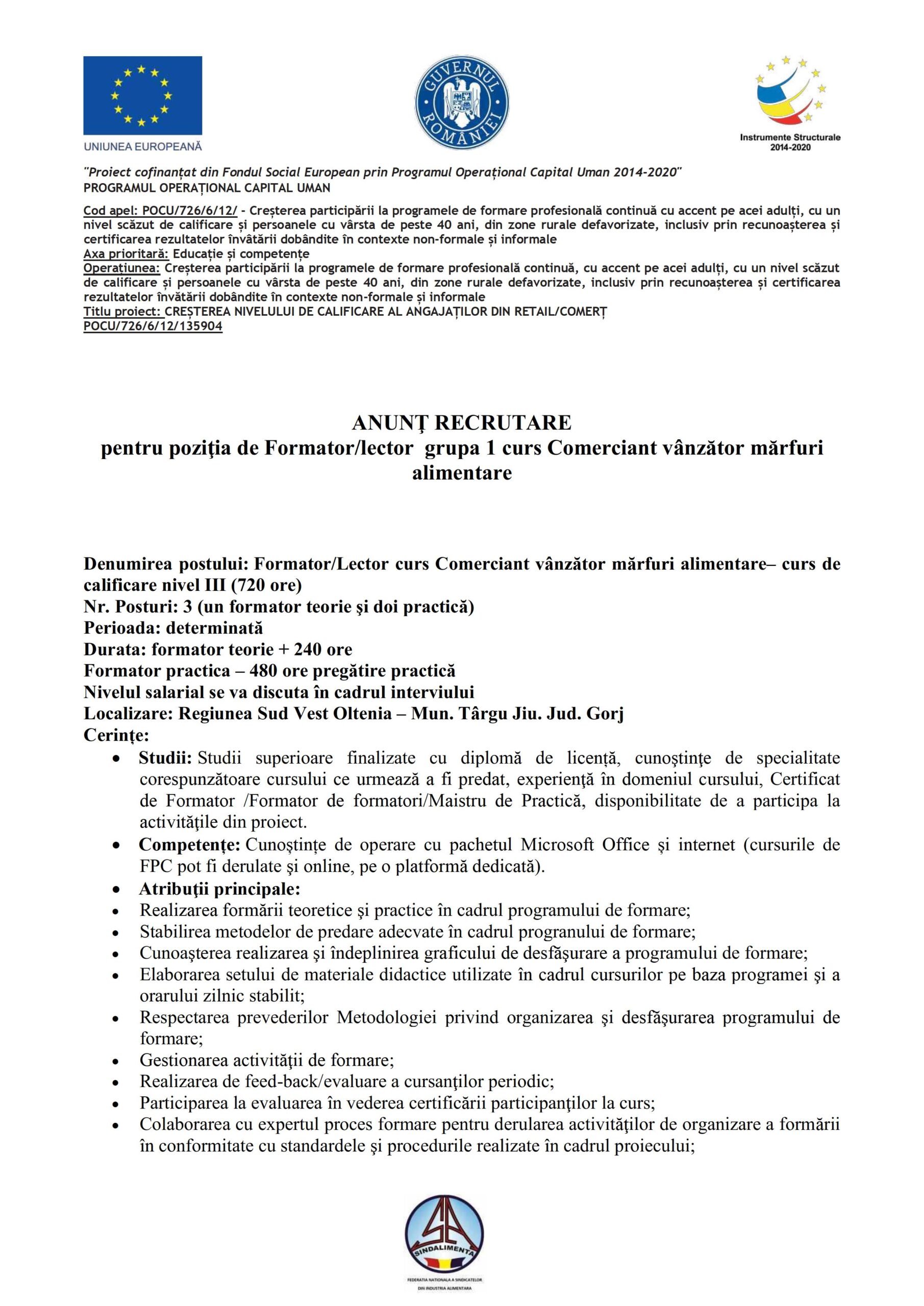 pentru poziţia de Formator/lector grupa 1 curs Comerciant vânzător mărfuri alimentare