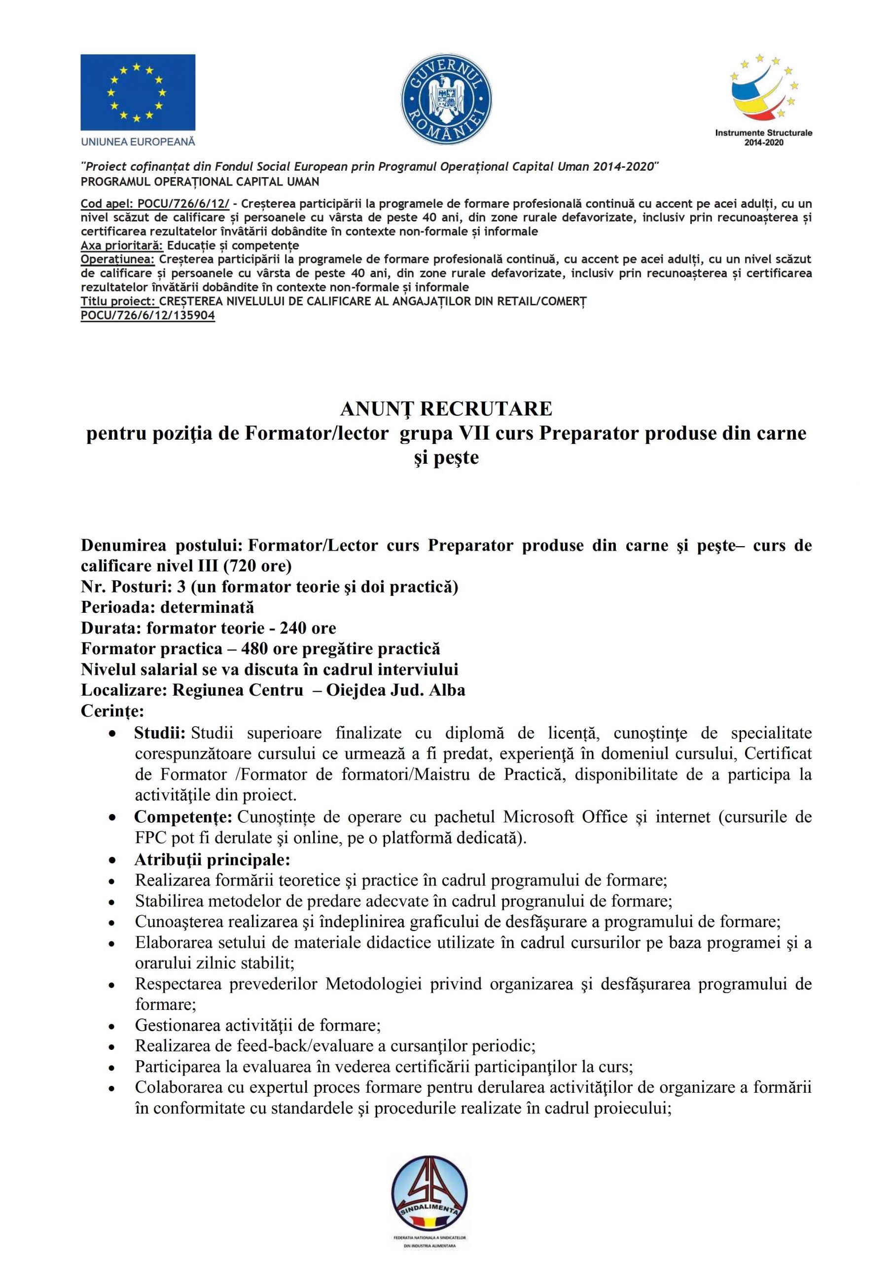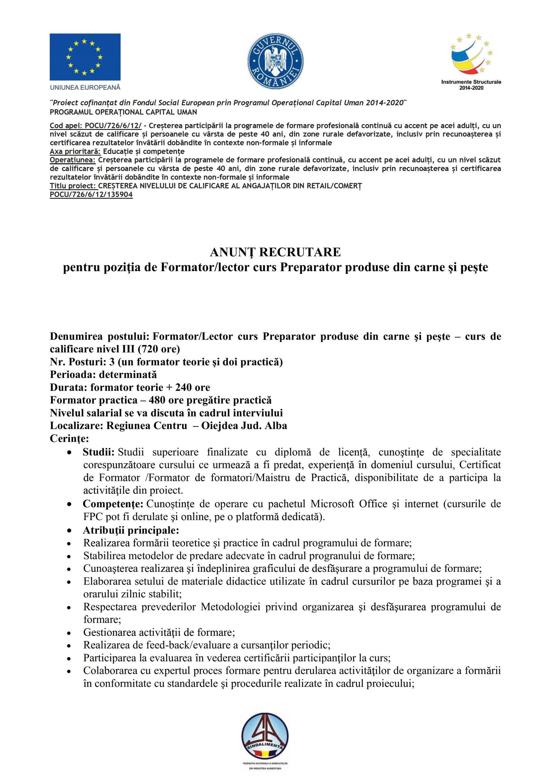 pentru poziţia de Formator/lector curs Preparator produse din carne şi peşte